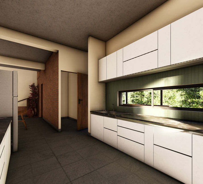The structure uses the rat-trap bond brick technique, chosen for its thermal efficiency and its ability to express texture without additional finishes. Courtyards and alternating terraces are placed strategically to bring in light and air while opening up visual connections between levels. These outdoor spaces form pauses within the house, breaking down its mass and allowing movement between inside and outside to feel effortless.